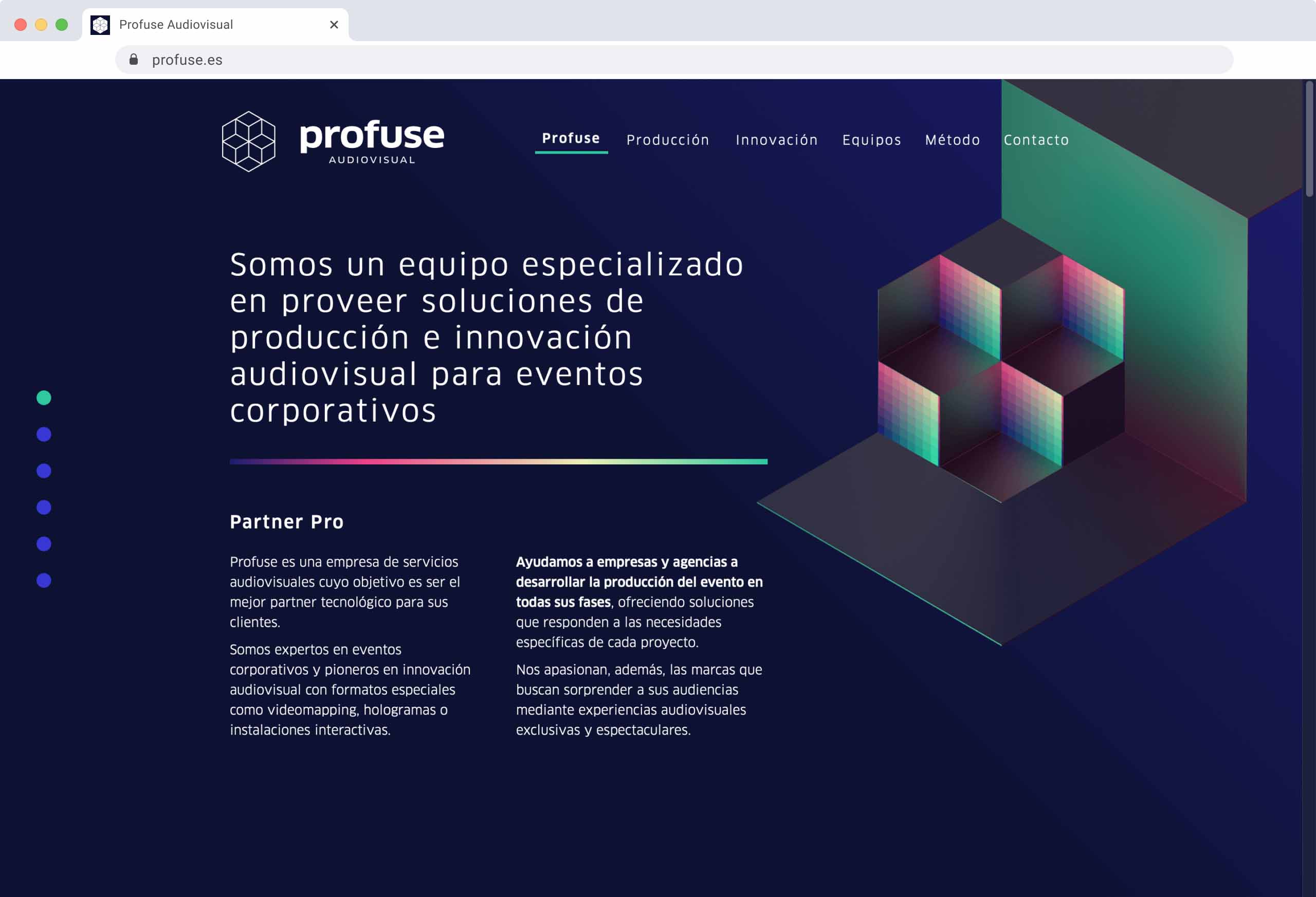 I worked with Profuse Audiovisual to review its bussines model. We created a fully new corporate image and identity through a new name, logo and website.